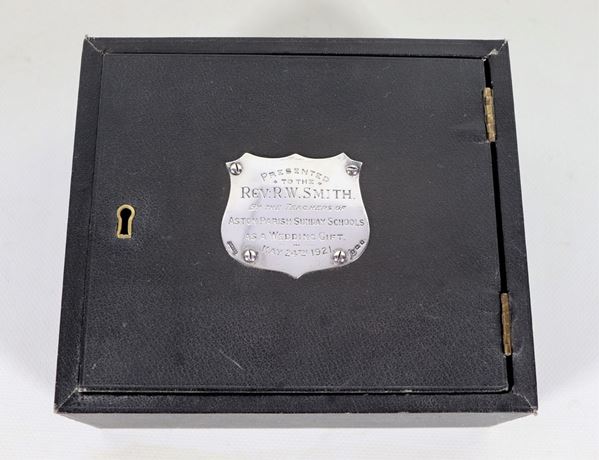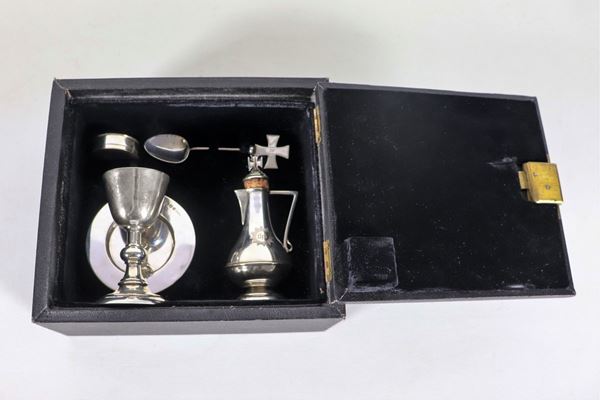 Silver travel set for religious functions, Edward VII era, leather case with silver plate on the lid (5 pcs)