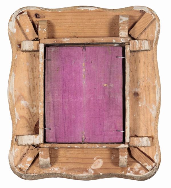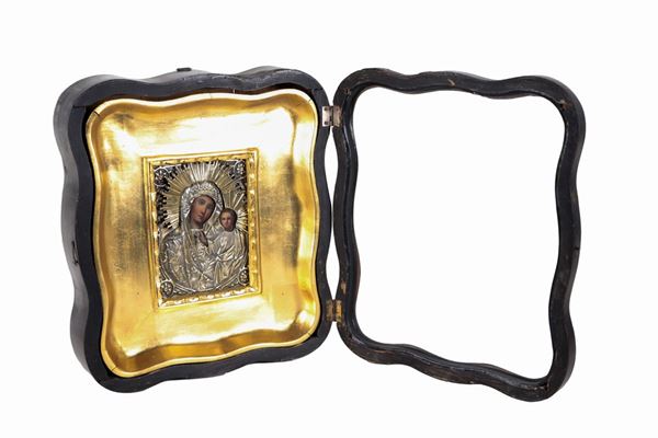 frame in gilded wood, enclosed in a showcase in ebonized wood and glass. Icon 18 x 14 cm, showcase 37.5 x 33 cm.