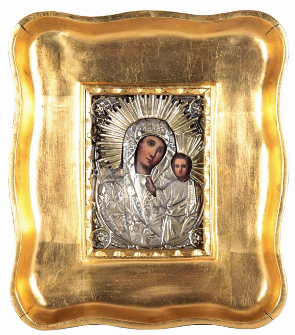 Small travel icon "Mother of God of Kazan", painted on wood with silver bristles