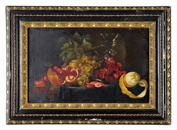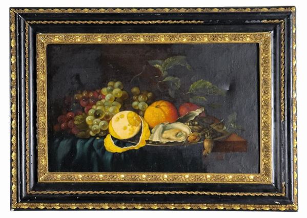 "Still lifes with fruit, crustaceans and molluscs", pair of small oil paintings on canvas
