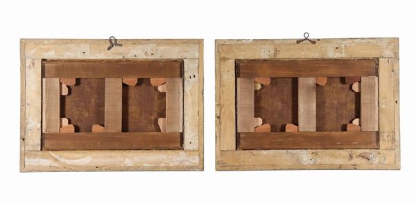 ebonized and gilded frames. The paintings show old restorations, 28 x 44 cm each.
