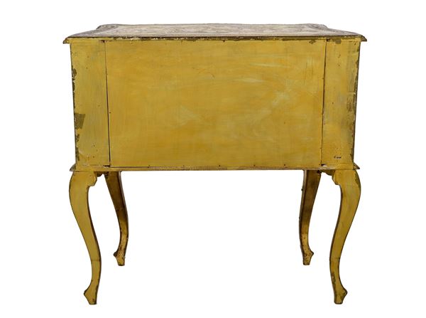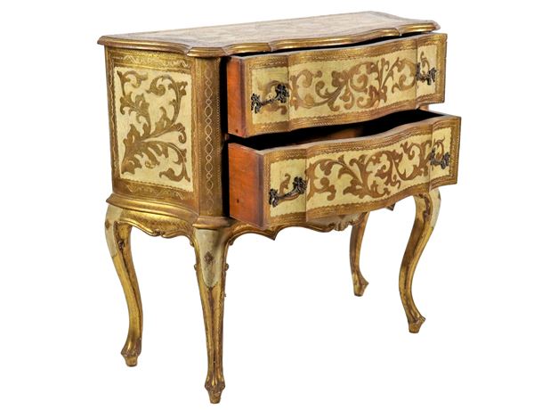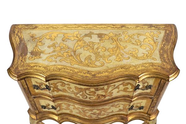Bedside table from the Marche region in gilded and ivory lacquered wood with arched shape