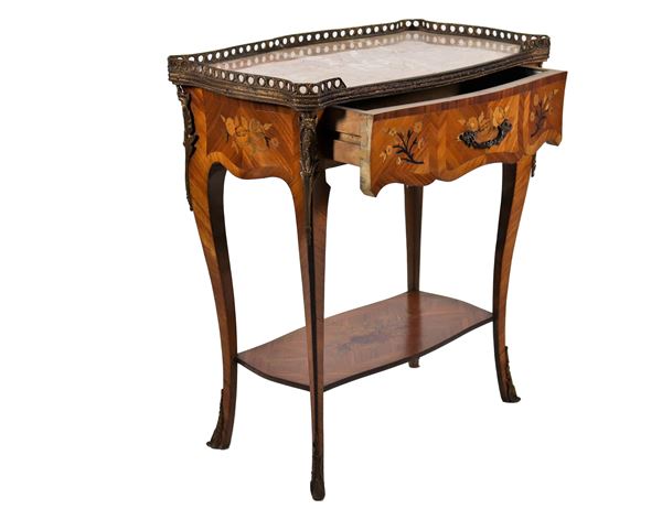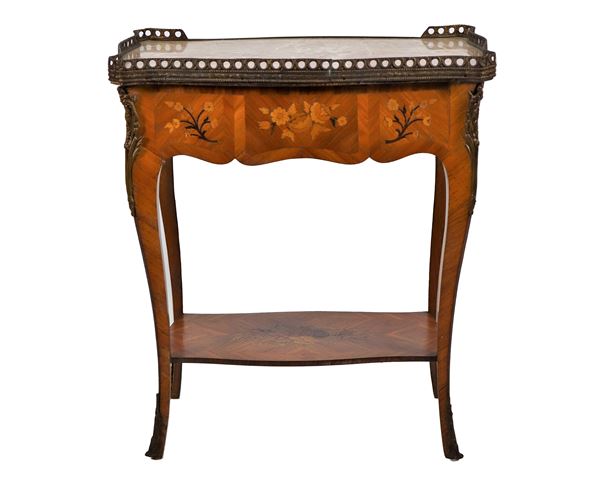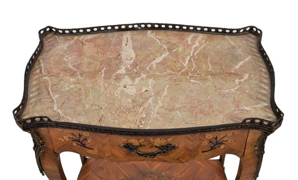French bedside table from the Louis XV line in bois de rose and purple ebony, with floral motif inlays and marble top with perforated railing [..]