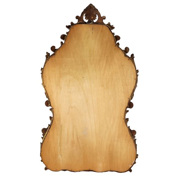 French mirror of the Louis XV line with arched shape, in gilded wood and carved with motifs of volutes and curls