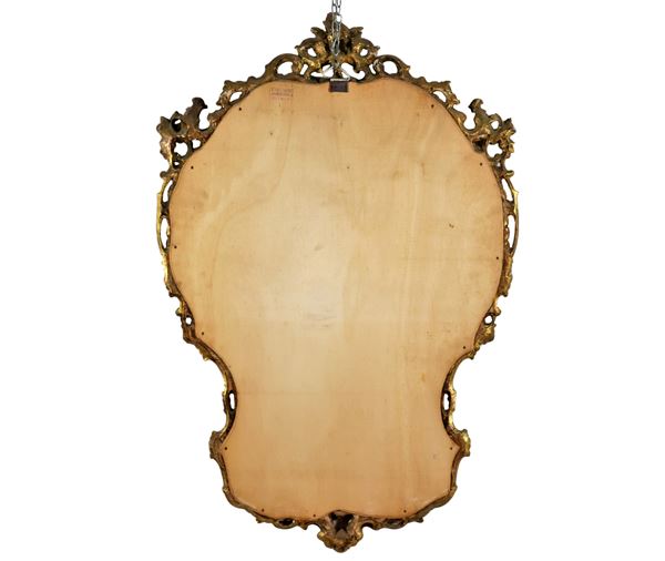 French mirror of the Louis XV line with arched shape, in gilded wood and carved with motifs of volutes and curls
