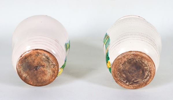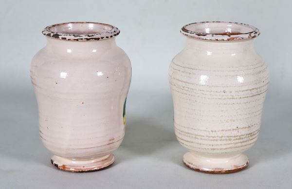 Pair of small pharmacy albarelli in glazed Italian majolica, with colorful decorations with laurel wreath motifs and an inscription in the ce [..]