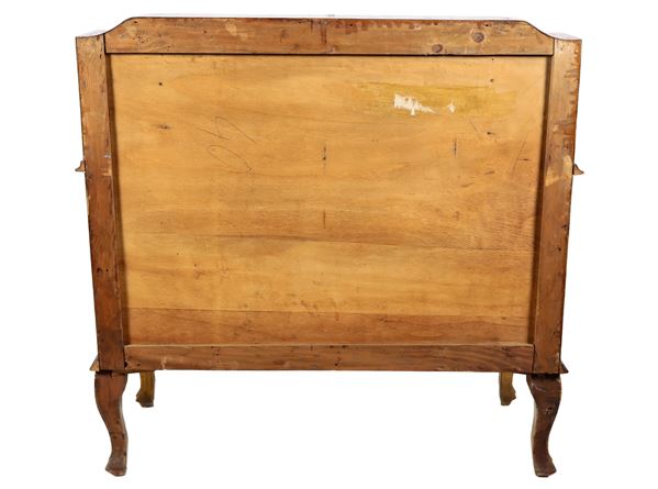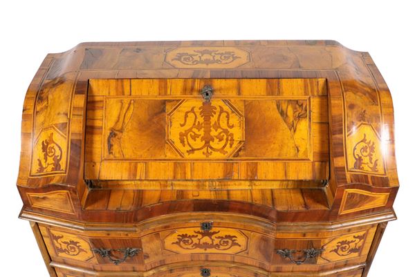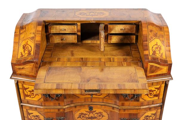 Small Veronese flap table of the Louis XV line, in walnut and burr walnut with intertwined scroll inlays