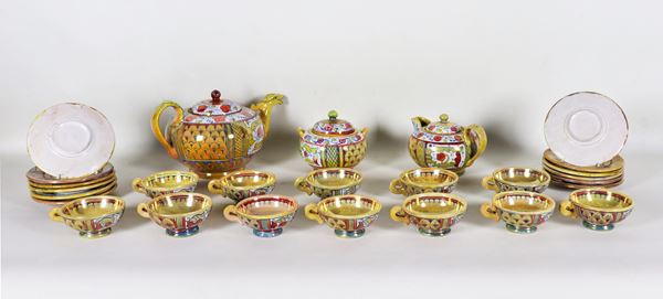 Tea service in glazed majolica S.C.U. (Umbre Ceramic Company) Gubbio - Lorenzo Rubboli 1920, with polychrome decorations with floral motifs [..]