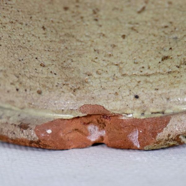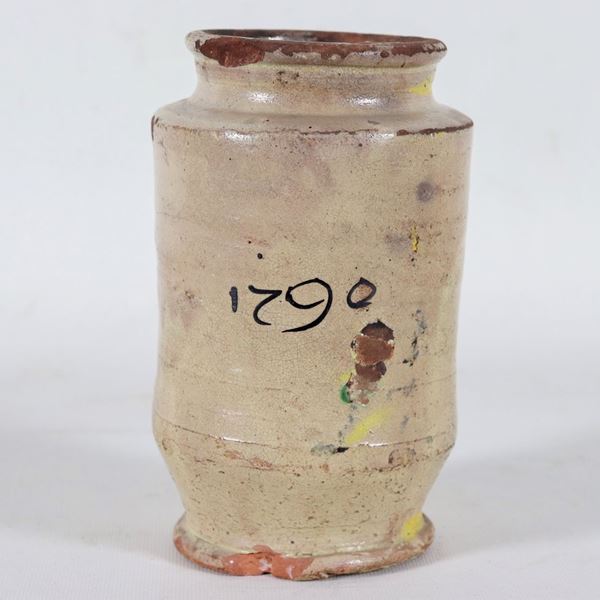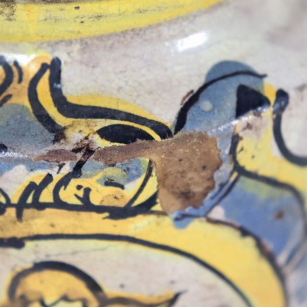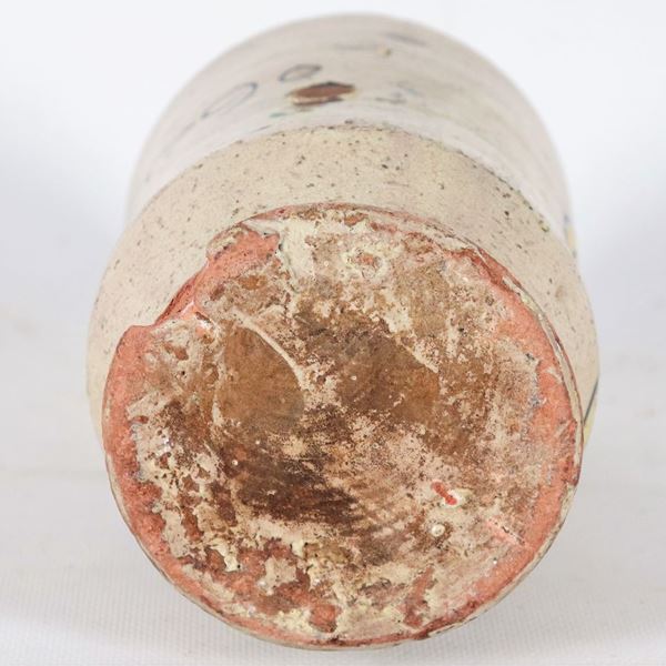 Ancient pharmacy albarello in Tuscan majolica with polychrome medallion, lacks and defects