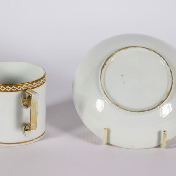 Antique cup and saucer in white porcelain and pure gold, with painted panels "The Temple of Portuno" and "The Basilica of Santa Maria in Cosm [..]