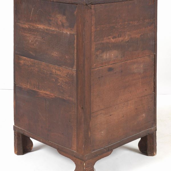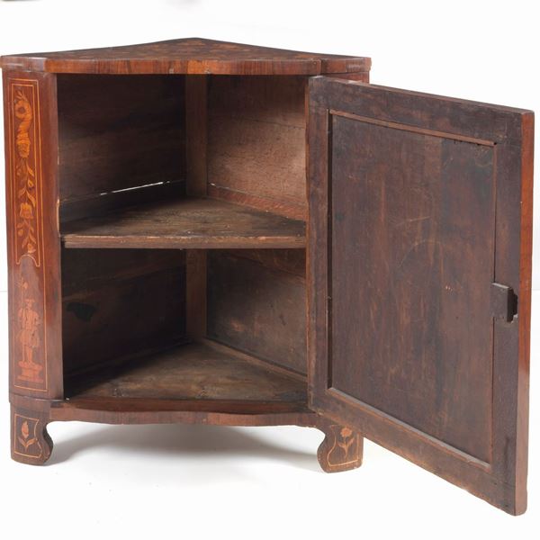 Antique Dutch walnut corner cupboard, entirely inlaid in various woods with figures of knights, medallions and floral intertwining, a central [..]