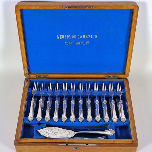 Antique fish cutlery set in chiseled and embossed silver (26 pcs), gr. 1345
