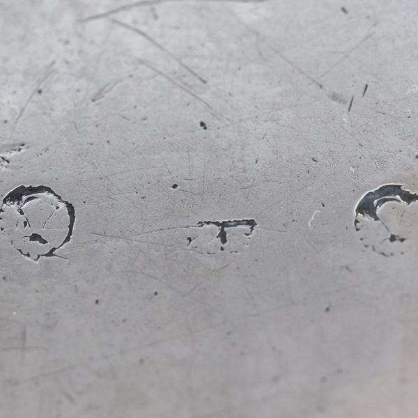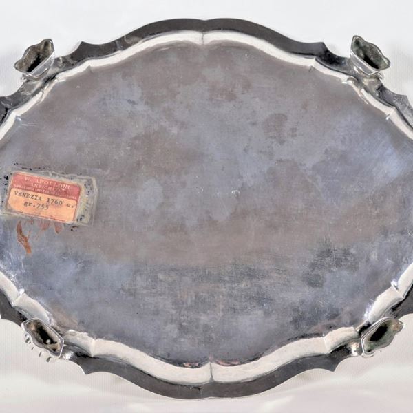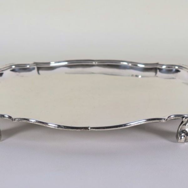 Antique oval silver tray with arched and embossed edge, supported by four leonine feet, gr. 755