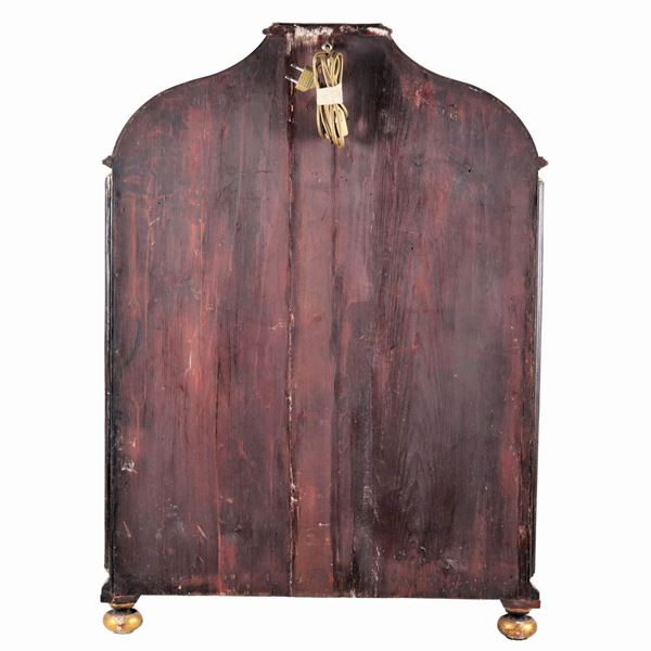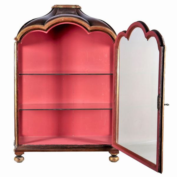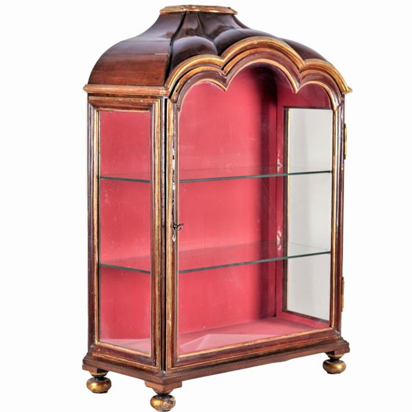 Antique table showcase in walnut with gilded profiles, a glass door and onion legs