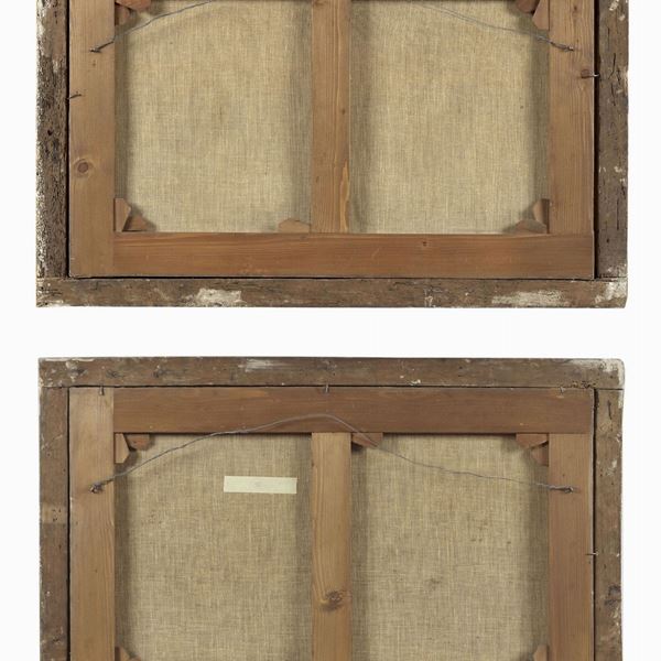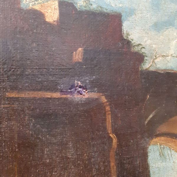 Attributed. "Ruins with architecture and characters", pair of oil paintings on canvas of fine pictorial execution