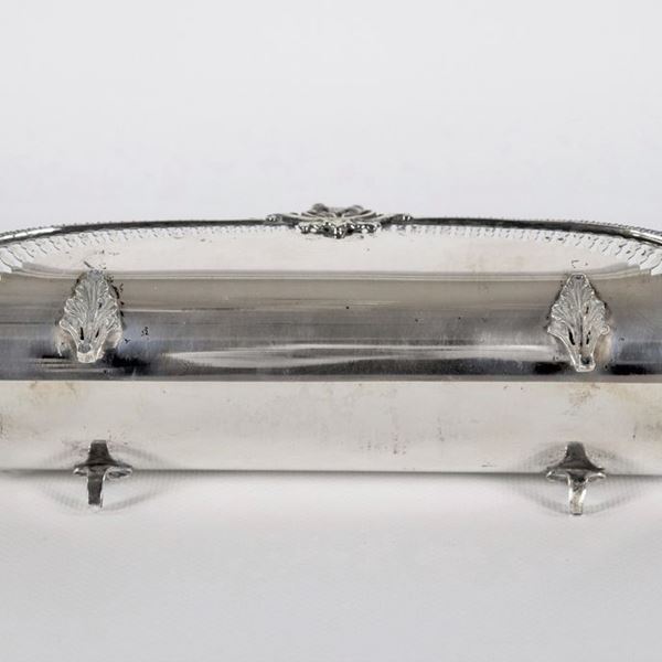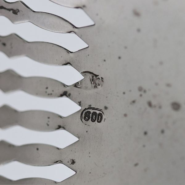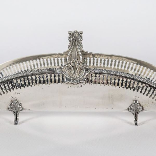 Breadstick holder in chiselled, embossed and perforated silver, supported by four curved feet, gr. 160
