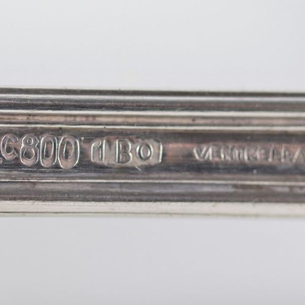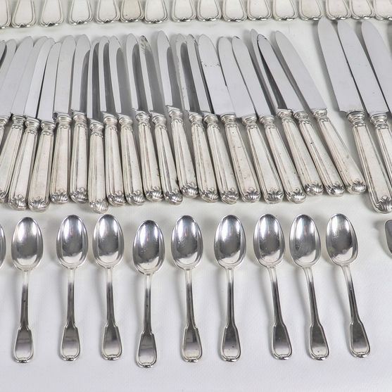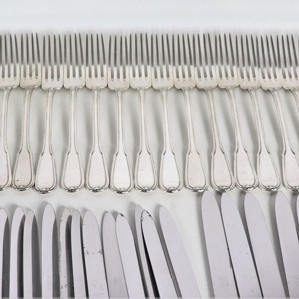 consisting of: 12 large spoons, 24 large forks, 11 large knives, 12 fish forks, 12 fish knives, 12 dessert spoons, 24 dessert forks, 24 dessert knives, 10 teaspoons, 6 ice cream spoons, 5 coffee spoons, 2 ladles, 1 ladle, 1 spoon, 1 fork and 2 fish serving cutlery.