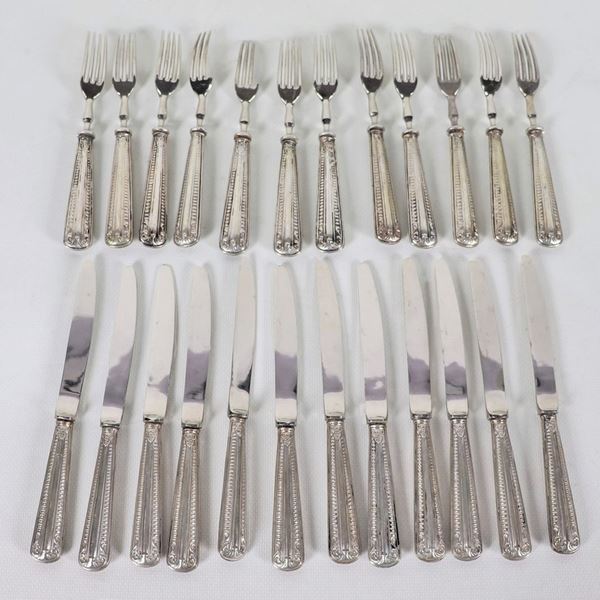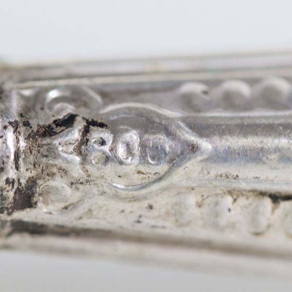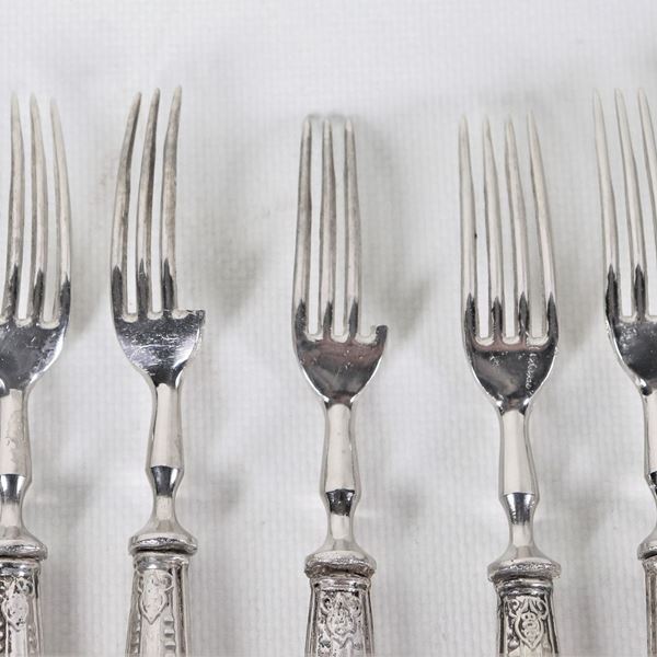 Dessert cutlery with handles in chiseled and embossed silver, two forks are missing one of the prongs, silver weight gr. 120