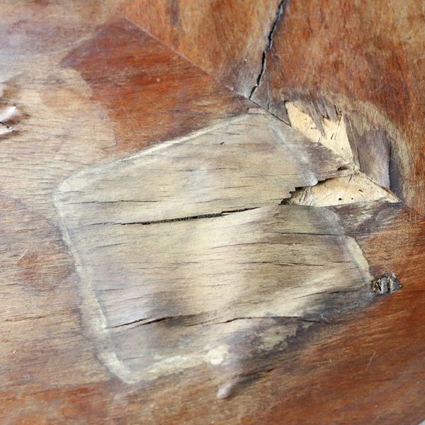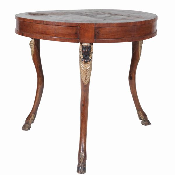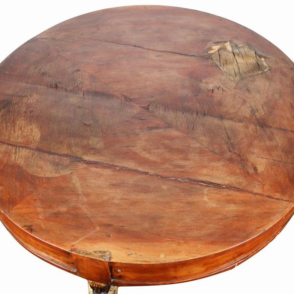 Empire center table in walnut, round shape with three gilded and carved legs with heads of sphinxes, very damaged wooden top