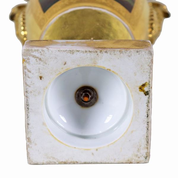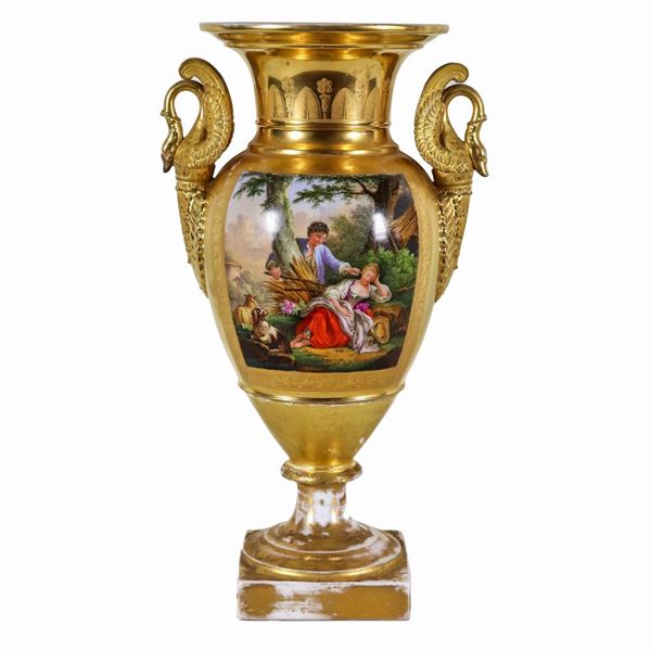 Empire period amphora vase in gilded porcelain, with painted squares of "peasant scenes" and handles with sculptures of swans, the base of the [..]