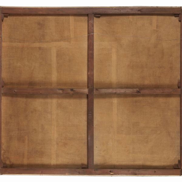 "Landscape with fantasy of ancient monuments", ancient large panel painted on canvas with thin oil, tempera and vegetable colors