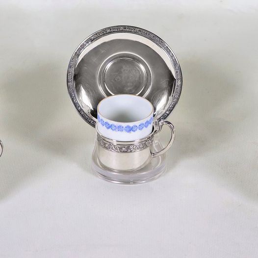 Lot of a pair of coffee cups and a single one, in porcelain with silver supports and saucers, (3 pcs), gr. 148