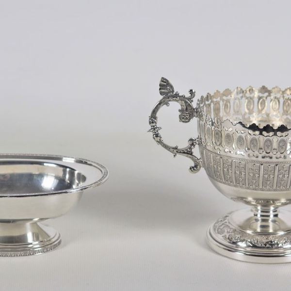 Lot of an oval silver tray marked Fornari gr. 128 and a silvered and chiseled metal cup marked W.M.F.
