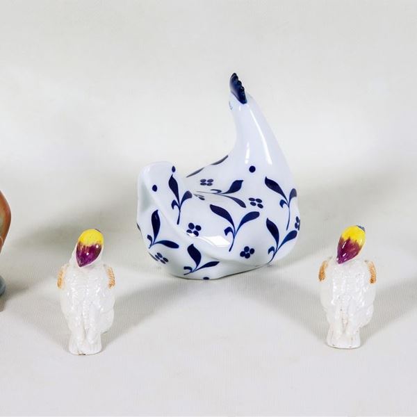 Lot of five polychrome porcelain figurines; two parrots, two ducks and a hen