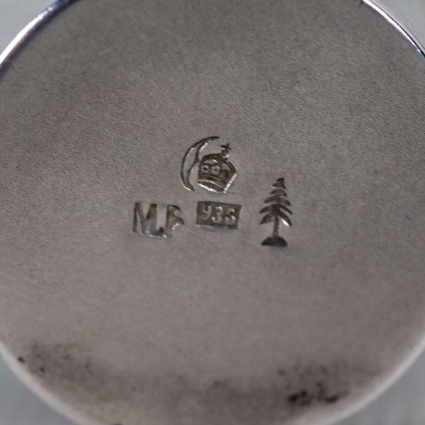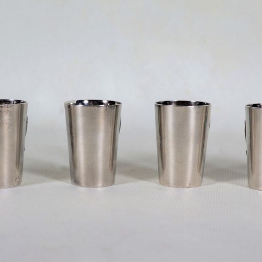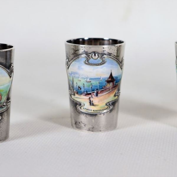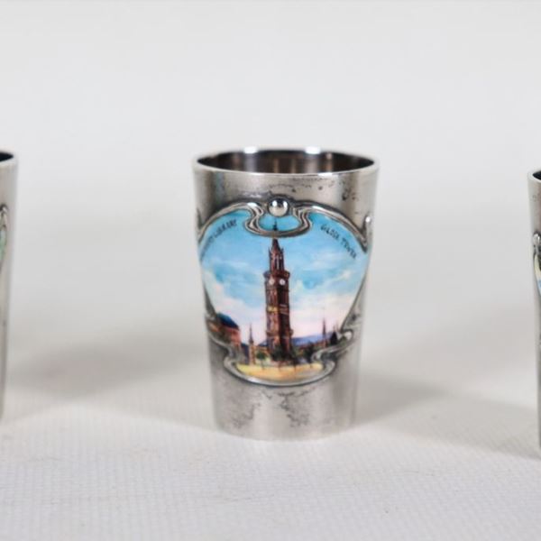 Lot of six small glasses in silver Title 935, with decorations in colorful enamels with motifs of landscapes, cities and characters, gr. 160