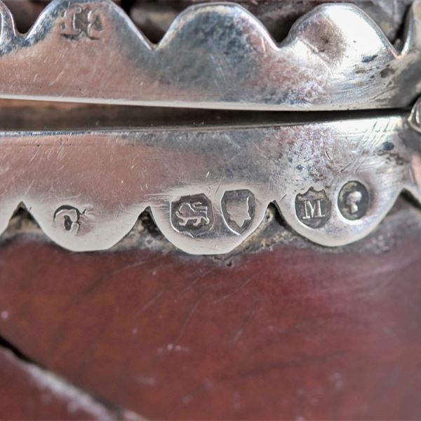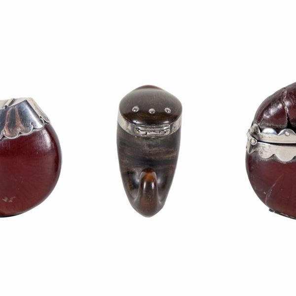 Lot of three English snuff mulls, one in curved goat horn and two in horse chestnut shells, one of which with silver trimmings. Shell defects [..]