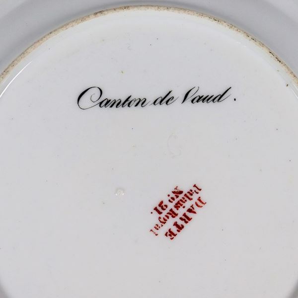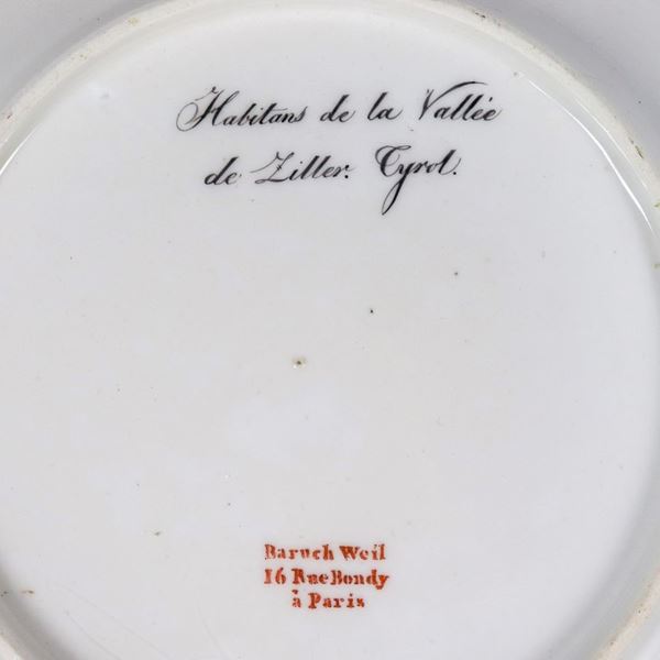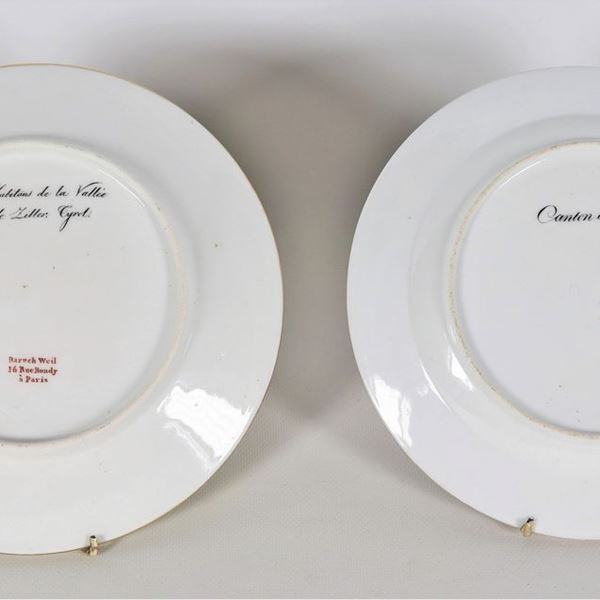 Lot of two plates in French porcelain in various polychromes, with painted medallions and pure gold highlights, "Habitans de la vallée de Zitter [..]