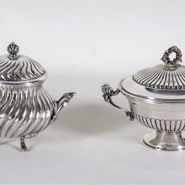 Lot of two sugar bowls in chiselled and embossed silver, one with Empire motifs and one with Louis XV motifs, gr. 365