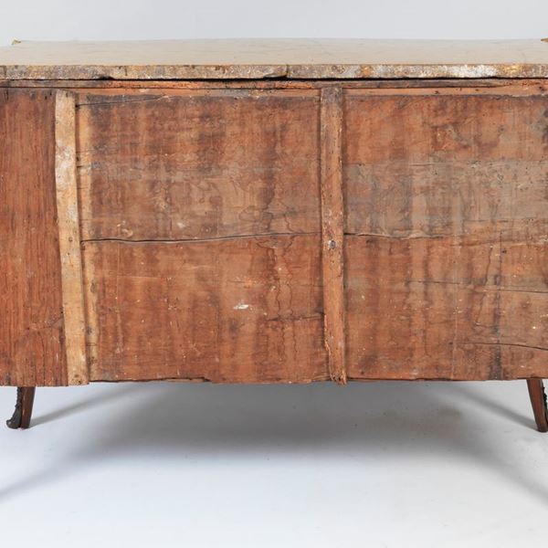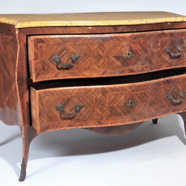 Louis XV Neapolitan chest of drawers with rounded shape in walnut and purple ebony, with inlays with geometric motifs of fillets and rhombuses, [..]