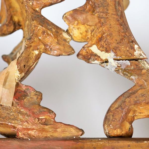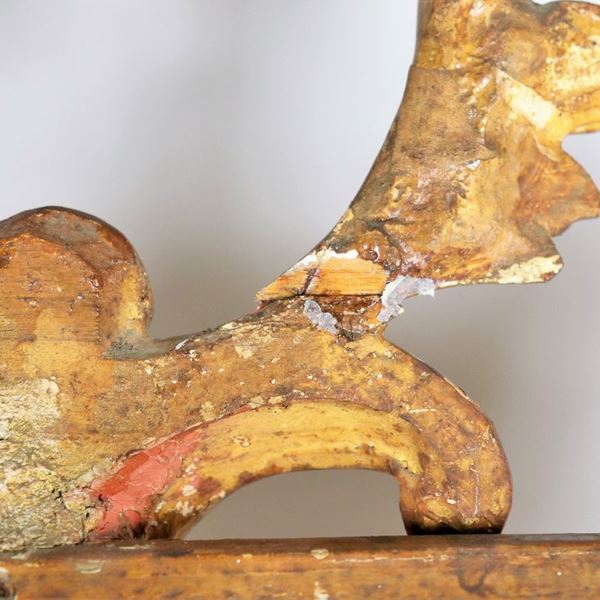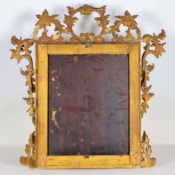 Louis XV Roman mirror in gilded wood, with friezes carved with scrolls of acanthus leaves and flowers, mercury mirror. The coping has a defec [..]