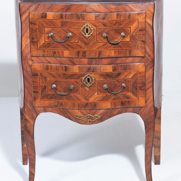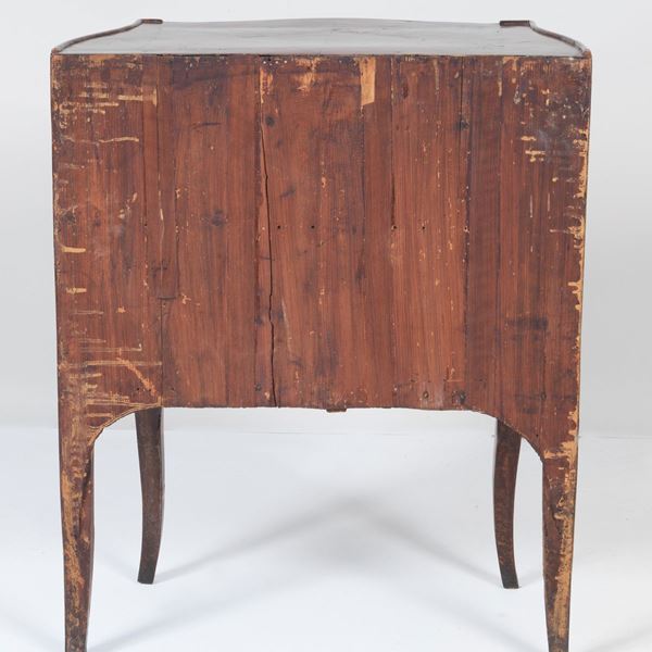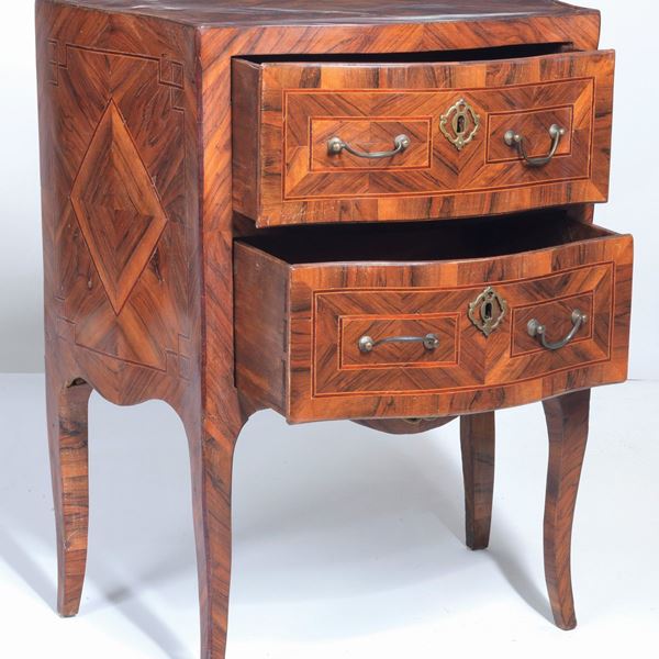 Louis XV Sicilian bedside table in wavy shape in walnut and purple ebony, with inlaid threads with geometric motifs and rhombuses on the sides, [..]