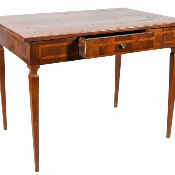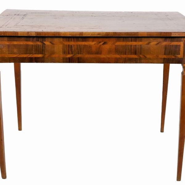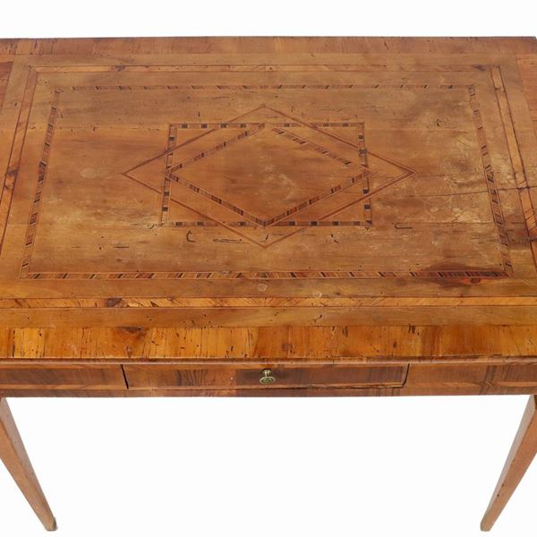 Louis XVI Lombard-Venetian centennial table in walnut, with inlaid top with geometric motifs, a central pull-out and four inverted truncated [..]