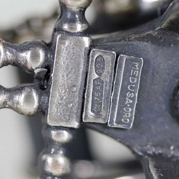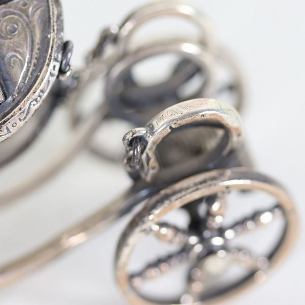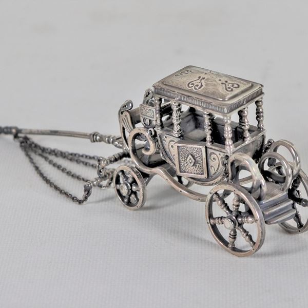 Model of an ancient carriage in chiselled and embossed silver, missing a small chain, gr. 200