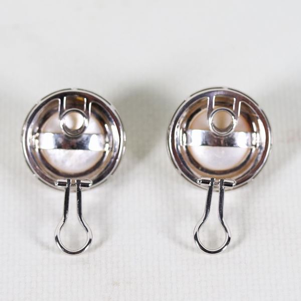 Pair of 18kt white gold clip earrings with large central pearl surrounded by a series of small diamonds, gr. about 17