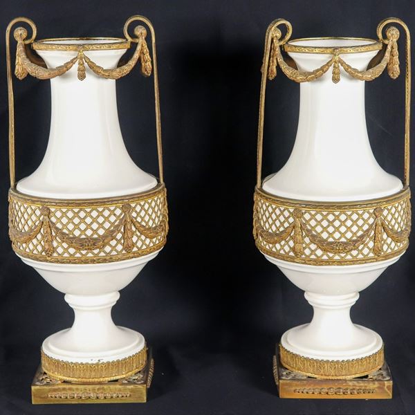 Pair of amphorae in white glazed and porcelain ceramic, with gilt and chiseled bronze trimmings, handles and bases with Louis XVI motifs