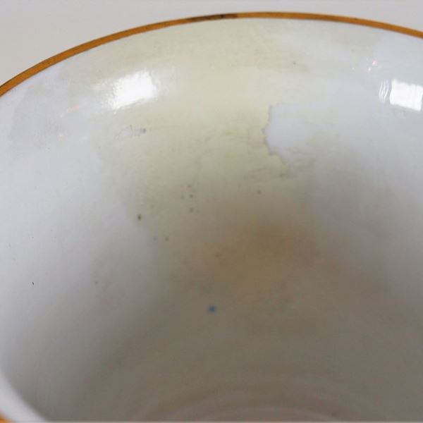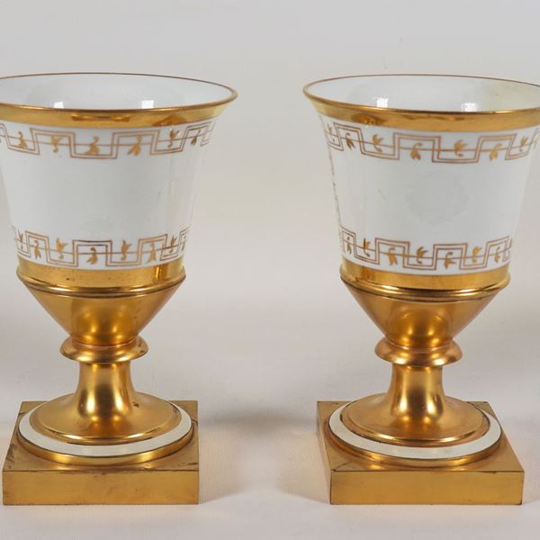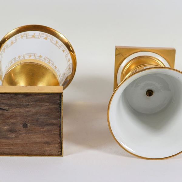 Pair of ancient Neapolitan vases in white and gold porcelain with painted squares "The entrance to the Grotta di Pozzuoli" and "View of Palazzo [..]
