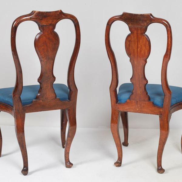 Pair of antique Dutch walnut chairs, entirely inlaid in various woods with figures of cherubs and floral intertwining, four curved legs