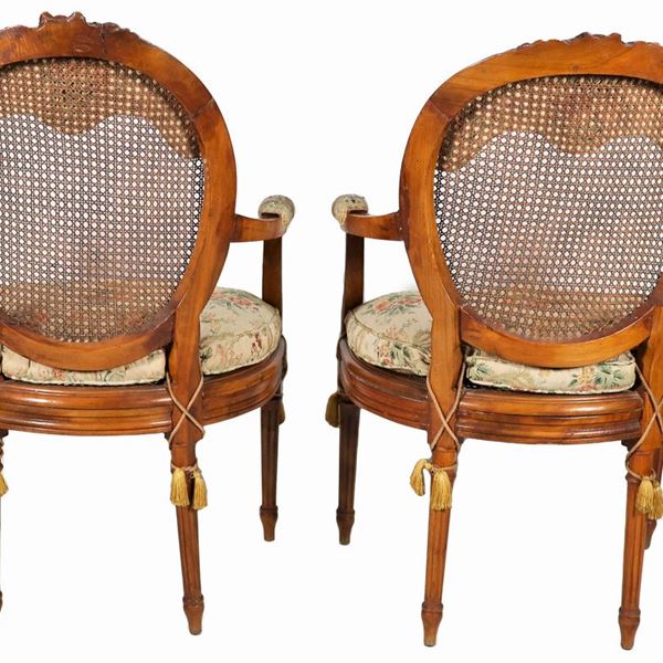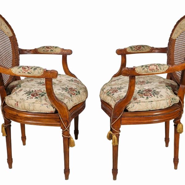 Pair of antique French walnut armchairs carved with Louis XVI motifs, with medallion backs and fluted legs, canneté cover with cushions in floral [..]