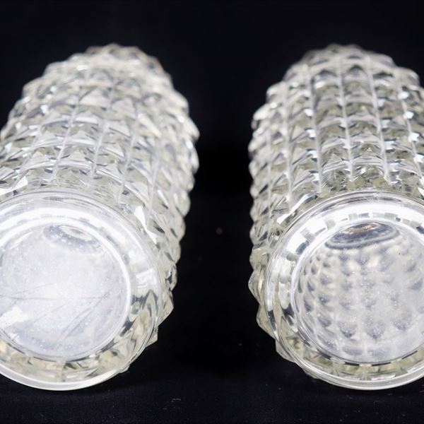Pair of cylindrical liqueur bottles in relief-worked crystal, with silver-coated necks