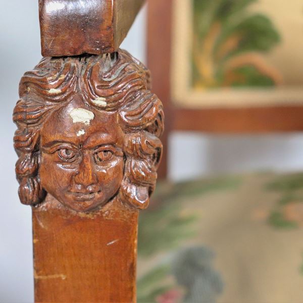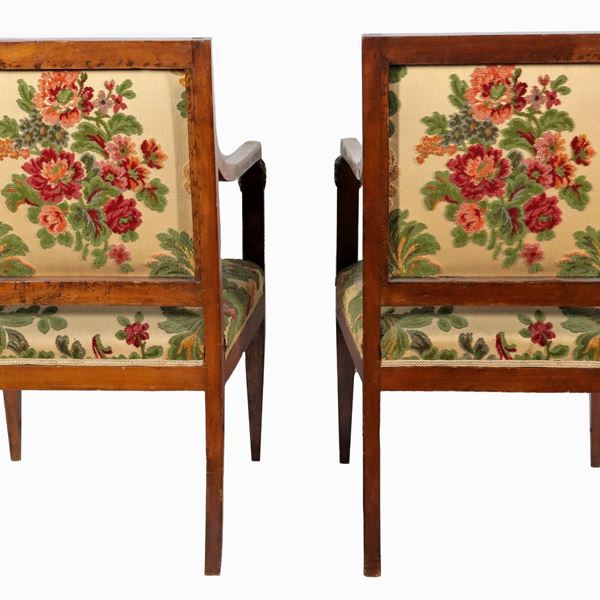 Pair of Empire period armchairs in walnut, with lion heads on the armrests and cover in floral fabric