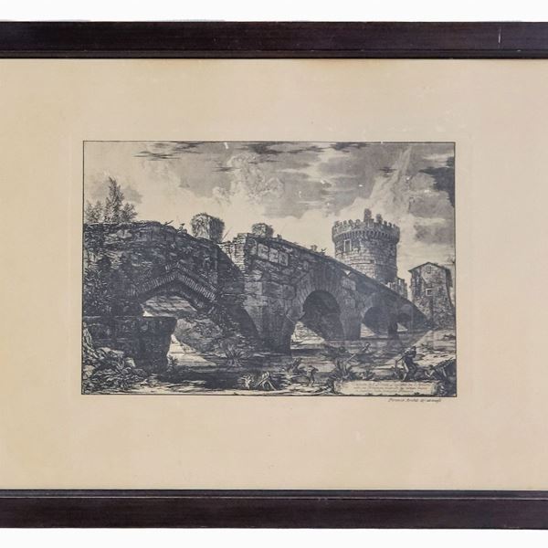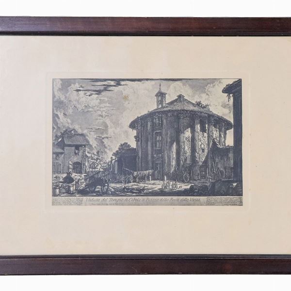 Pair of engravings "View of the Lugano bridge over the Anione" and "View of the Temple of Cybele in Piazza della Bocca della Verità"