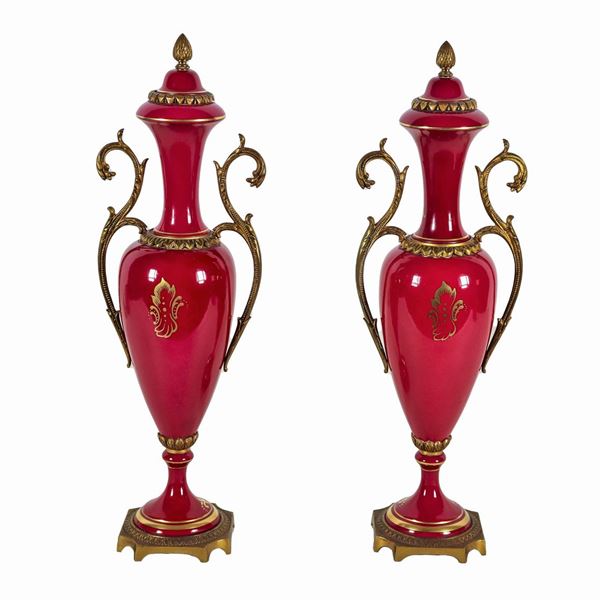 Pair of French amphorae in red porcelain with polychrome decorations of bunches of flowers and gilded scrolls, handles and bases in gilded br [..]