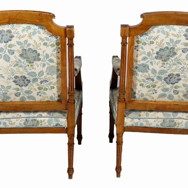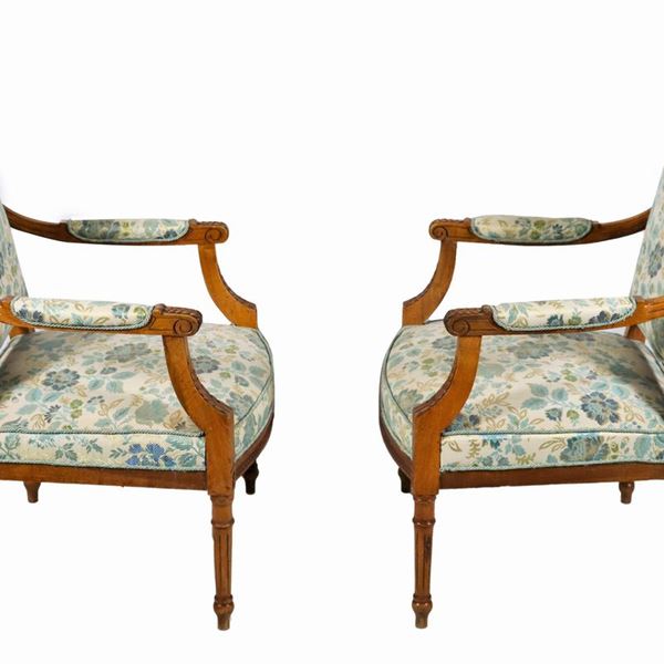 Pair of French armchairs from the Louis XVI line in carved decapé wood, covering in damask fabric