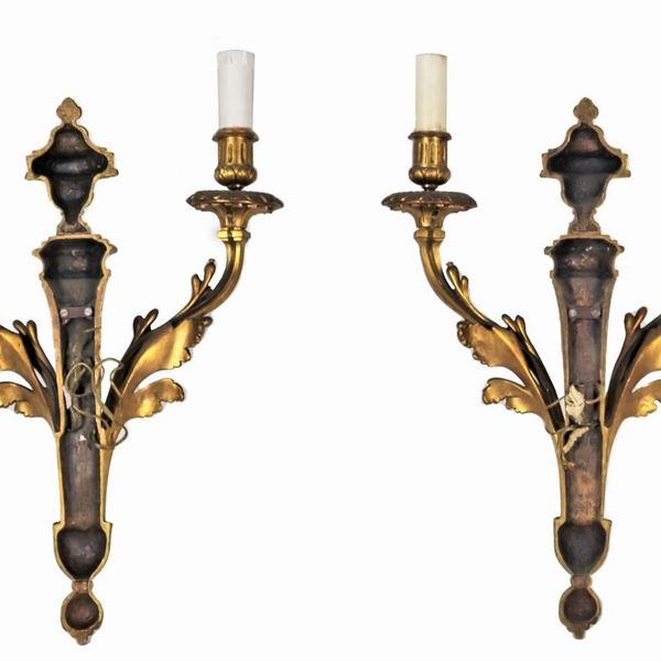 Pair of French sconces in gilded bronze, chiseled and embossed with Louis XVI motifs of amphorae and leaves, 2 lights each