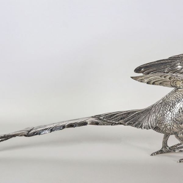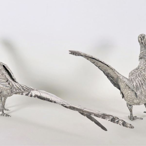 "Pheasants", pair of chiseled and embossed silver sculptures with extractable heads, gr. 1700
