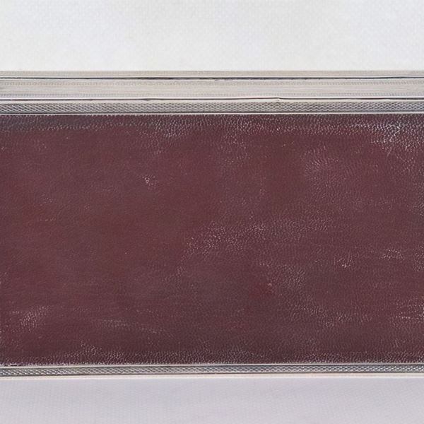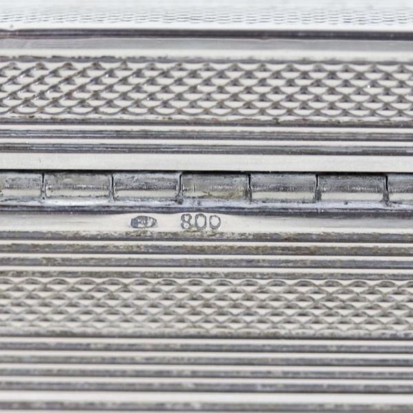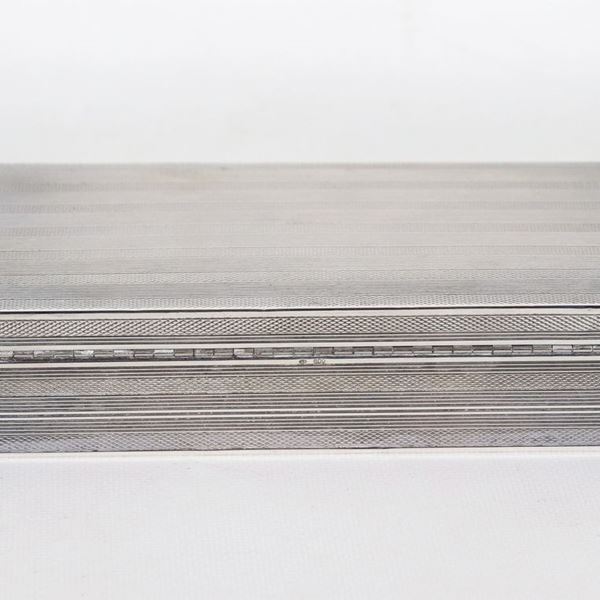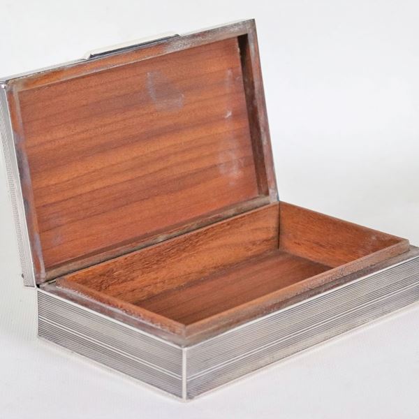 Rectangular cigarette box in silver and wood, chiseled with a guilloché motif